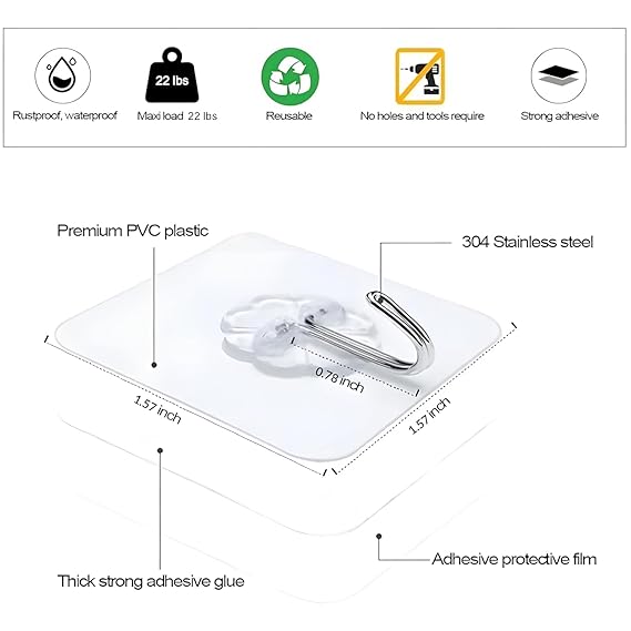 10 Pcs Transparent, PVC Heavy Duty Self Adhesive Stainless Wall Hooks 1.57 Inch, Waterproof and Oilproof Hooks for Kitchen Bathroom Shower Door Outdoor Home Improvement Utility Hook