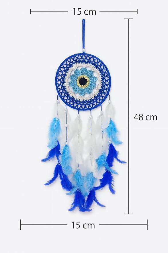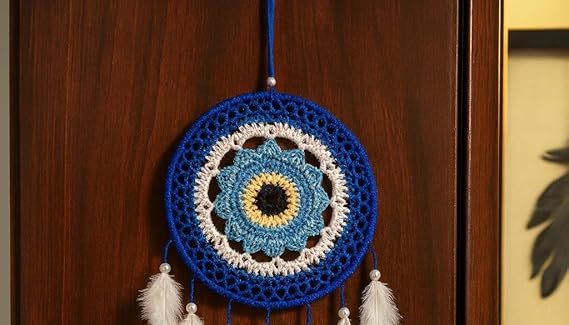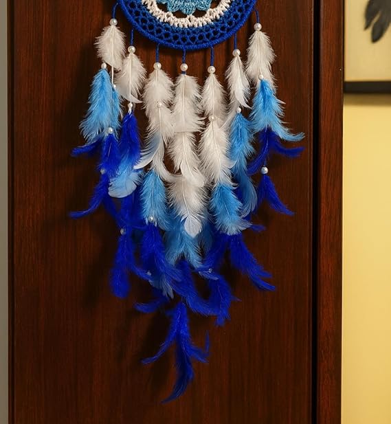 Handcrafted Crochet Evil Eye Dream Catcher with Blue & White Feathers – Wall Hanging Décor